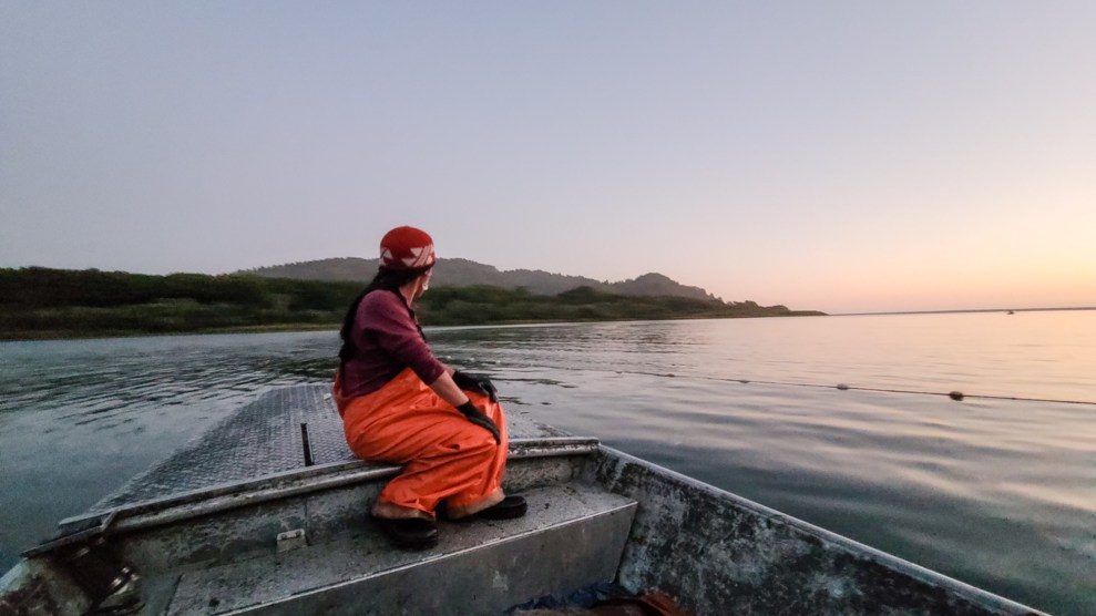 Yurok tribal attorney Amy Bowers, a friend of the author, watches her gill net while fishing for salmon on the Klamath River earlier this year.Brook Thompson