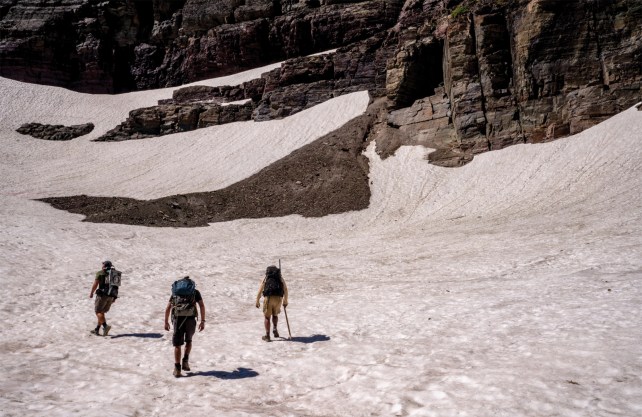 After the day of fieldwork in Glacier, the men packed up their gear and started slipping and sliding their way back down the snowfield. The Garden Wall rockface unfolded like a postcard in the distance. The snow we had just walked on now ran in rivulets, emptying onto the rocks below. We picked our way through muddy patches of trail and descended past a small waterfall, driven by an underground spring and snow melt. Some portion of the melt, however small, was caused by the living pink bloom we’d visited earlier that day. Time will tell if it will further dry out the already parched West. “The algae are just trying to survive,” Almela Gomez said. “They’re not guilty of anything.”