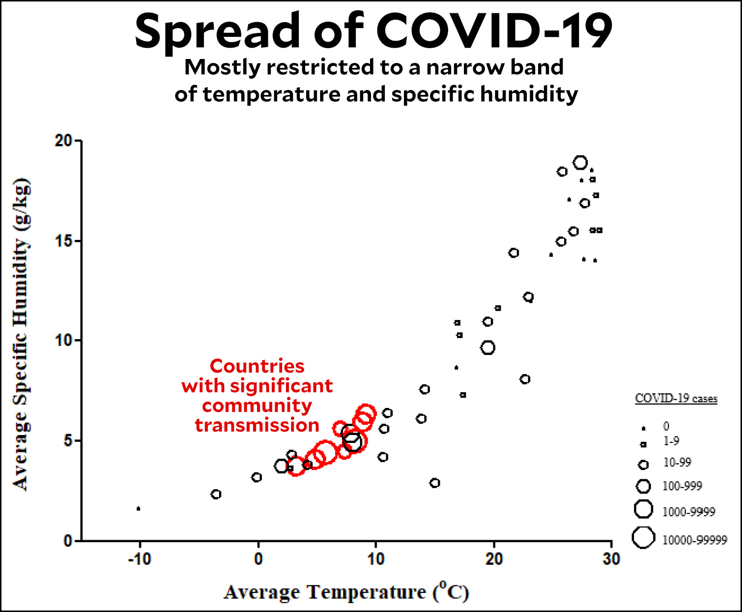As you can see, the biggest centers of infection have occurred within a fairly narrow band of cool temperatures and low absolute humidity: