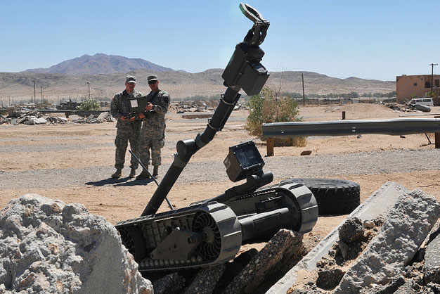 Pfc. Sean Robertson and Pvt. Geno Romero—both with 4th Stryker Brigade Combat Team, 2nd Infantry Division—practice climbing rubble with an iRobot Packbot 510 during a robotics class at Fort Irwin, Calif., on June 4. Robertson, a combat engineer with 38th Engineer Company, and Romero, a cavalry scout from A Troop, 2nd Squadron, 1st Cavalry Regiment, participated in the robotics course during Reception, Staging, Onward Movement, and Integration (RSOI) at the National Training Center. US Army photo by Sgt. Kimberly Hackbarth, 4th SBCT, 2nd Inf. Div. Public Affairs Office.