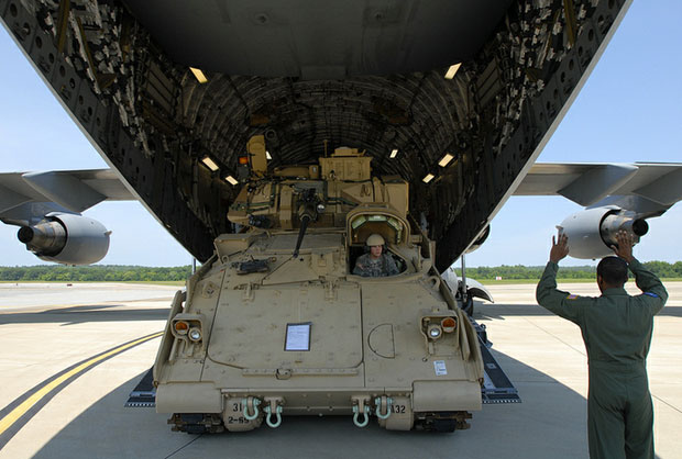 Pfc. Joseph Salerna, 2nd Battalion, 69th Armor Regiment, 3rd Heavy Brigade Combat Team, 3rd Infantry Division, backs his Bradley Fighting Vehicle aboard a C-17 Globemaster III aircraft with the help of an Air Force loadmaster, June 3, at Lawson Army Airfield, Fort Benning, Ga. Photo by the US Army.