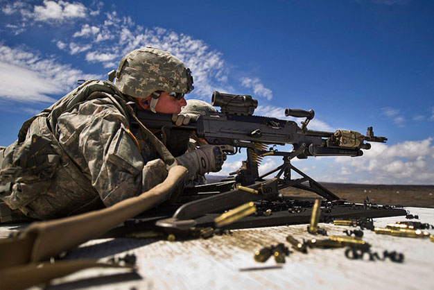 U.S. Army Spc. Geoffery Lovan, Alpha Company, 1st Battalion, 21st Infantry Regiment, 2nd Stryker Brigade Combat Team, 25 Infantry Division, Schofield Barracks, Hawaii fires a M240L Medium Machine Gun Sept. 19, 2012, at Pohakuloa Training Area, on Hawaii’s Big Island. Department of Defense photo by U.S. Air Force Tech. Sgt. Michael R. Holzworth.