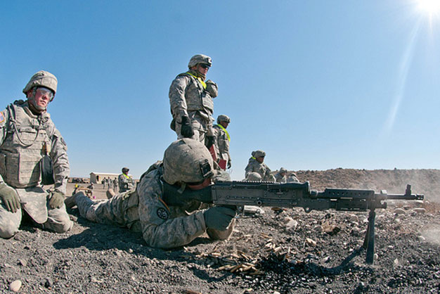 A Soldier assigned to 864th Engineer Battalion fires an M249 machine gun during a range, Oct. 7, 2012 at Orchard Combat Training Center, Idaho. The battalion is preparing for an upcoming deployment to Afghanistan. US Army photo.