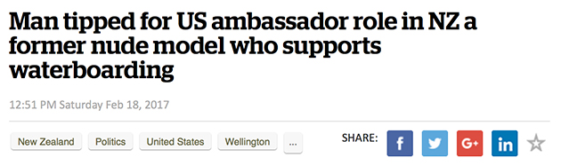 This nomination was rumored to be in the works for a while. Why do you care about this? I don’t know. Maybe you feel strongly about the US relationship with New Zealand. Maybe not. Here’s why I thought you might want to know about it: In February when the nomination was first floated in the media, New Zealand’s largest paper relayed the news in this hilarious way: