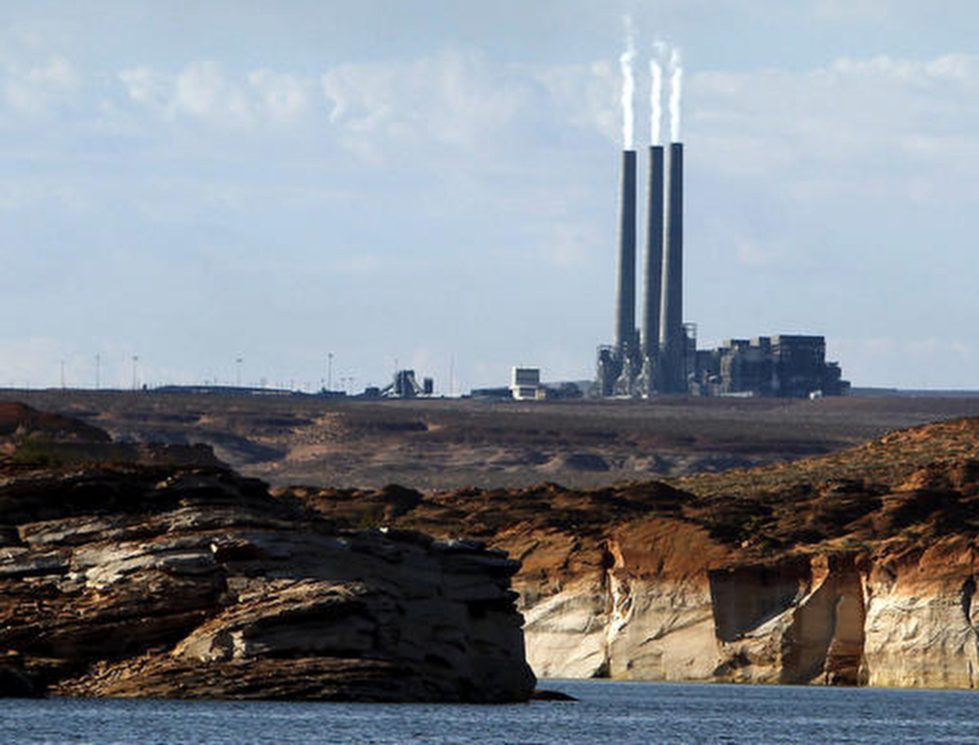 Smoke rises from the stacks of the main plant facility at the Navajo Generating Station, as seen from Lake Powell in Page, Arizona.