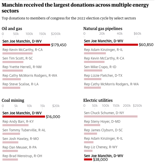 In the current electoral cycle, Manchin has received more in political donations from the oil and gas industry than any other senator, more than double the second largest recipient. He is also the No 1 beneficiary of donations from the coal mining sector, leads the way in money accepted from gas pipeline operators, and is sixth in the ranking of senatorial donations from electricity utilities.