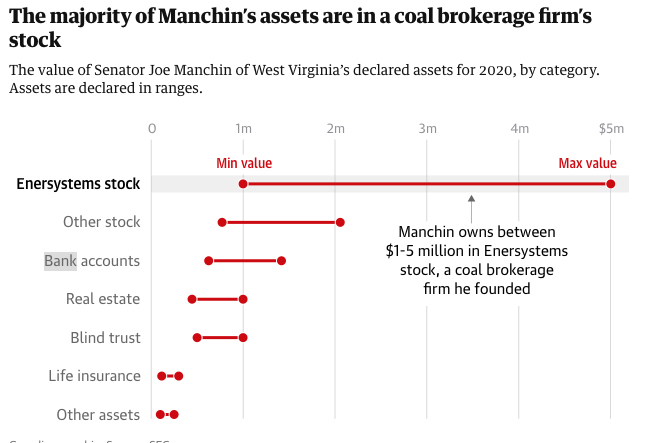 But Manchin’s ties to the fossil fuel industry run deeper than political donations. After initially working in his family’s furniture and carpet business, Manchin set up a coal brokerage firm called Enersystems in 1988, running it until he became a full-time politician.