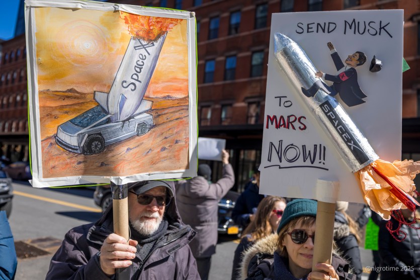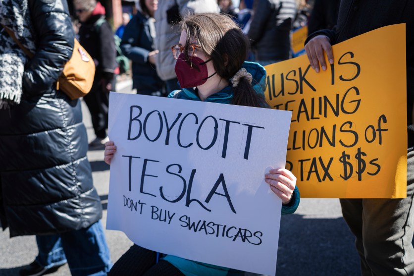 From Ohio to California, people demonstrated outside Tesla showrooms, some attracting large police presences. In New York, where at least nine NYPD officers were seen protecting a single Cybertruck, at least six protesters were reportedly detained. Instances of property damage against Teslas were also reported. Meanwhile, Tesla’s numbers have taken a significant dip amid Musk’s illegal takeovers and mass firings. NBC News reports that February was the electric vehicle company’s “worst month on the stock market since 2022.”