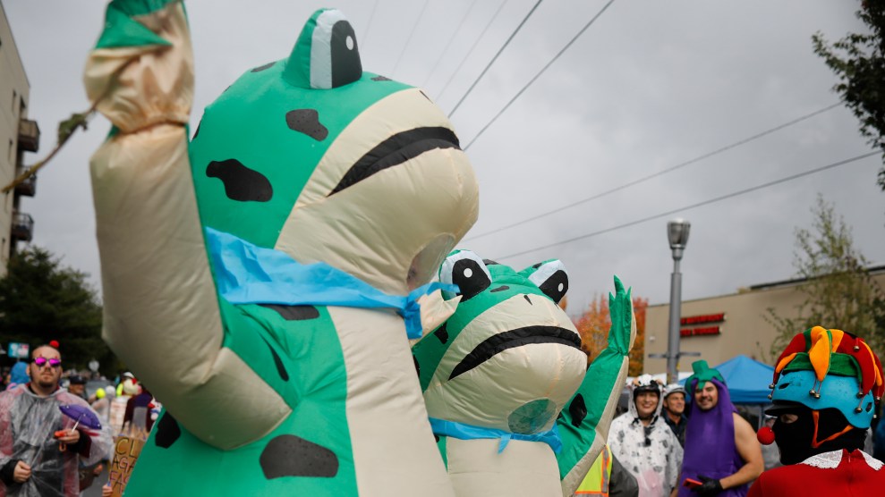 Saturday, October 11, marked another major escalation of force by the feds on peaceful protesters in Portland. At least ten arrests were made, and hundreds of less-lethal munitions were fired. Nonetheless, the ever-more creative Portland demonstrators were undeterred. From the Portland Frog Brigade to an emergency naked bike ride—which Republican House Speaker Mike Johnson found threatening—Portland is determined to put Trump on his heels by keeping Portland weird.